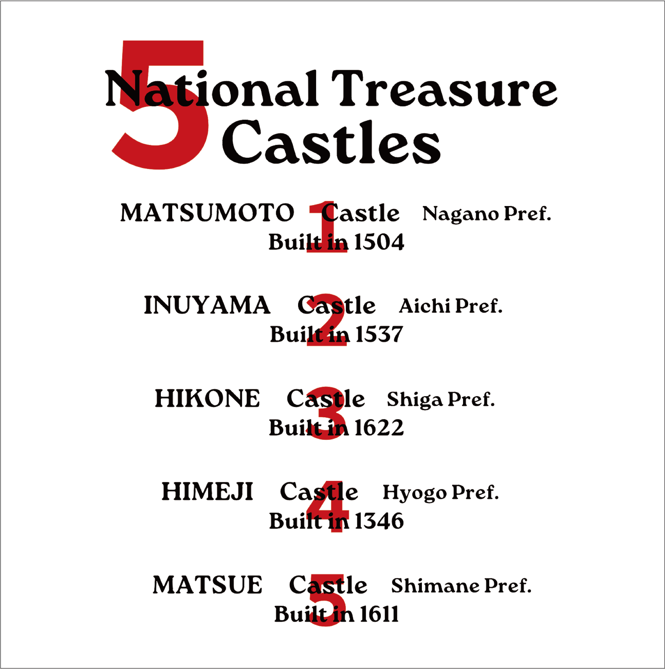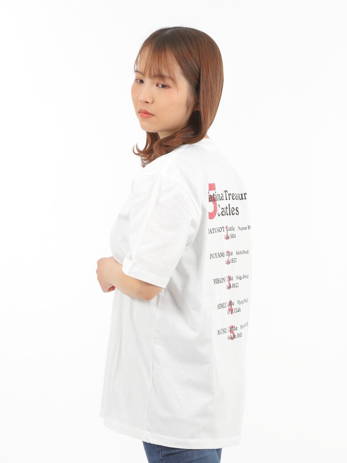 現存天守12城(日本の城の天守のうち、江戸時代またはそれ以前に建設され、現代まで保存されている天守)のうち、国宝に指定されている5城(松本城・犬山城・彦根城・姫路城・松江城)を背面に配置。ツアーTシャツ風デザインでかっこよく着こなせますよ。