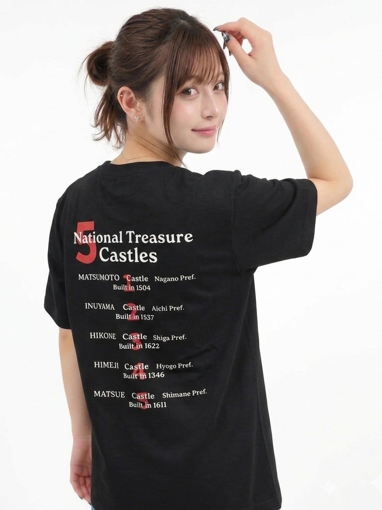 それぞれの築城年もクレジットされ、歴史の重みを感じさせつつも、ストリートシーンに映えるタイポグラフィを採用しとさせるバックプリントが、日常のコーディネートに遊び心を加えます。